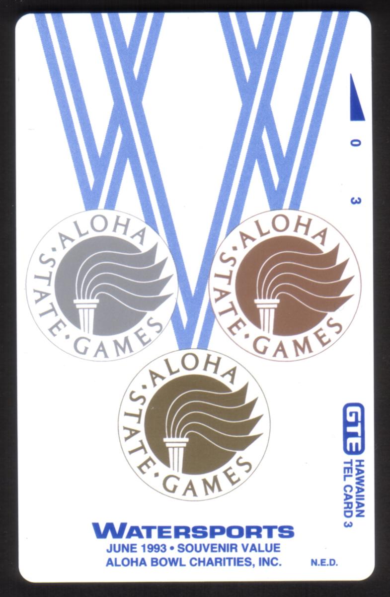 The overall design emphasizes the theme of sports, particularly watersports, through the depiction of medals awarded at the Aloha State Games. The presence of GTE Hawaiian Telephone branding indicates that this card was created as a commemorative phone card, likely capturing the essence and spirit of the 1993 sports event held in Hawaii.