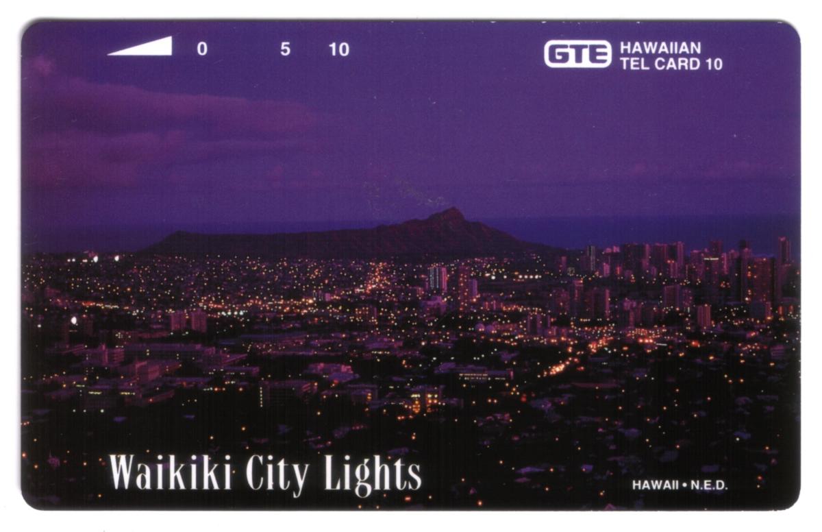 This phone card captures the essence of Hawaii’s iconic skyline and beaches through its depiction of Waikiki’s illuminated cityscape, appealing to collectors interested in travel, sightseeing, and Hawaiian imagery.