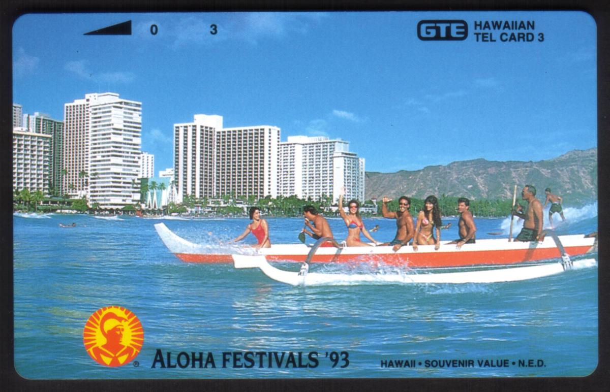 This collectible phone card represents a blend of Hawaiian culture, outdoor activity, and tourism, making it a valuable item for collectors interested in Hawaii memorabilia, watersports, or telephone card history. The image portrays both the natural beauty of Hawaii and a group engaging in a traditional Hawaiian sport, highlighting the festive and communal spirit of the Aloha Festivals.