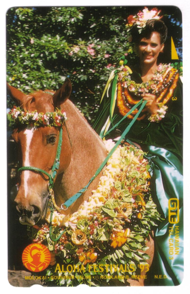 This collectible phone card captures the essence of Hawaii’s Aloha Festivals through the elegant portrayal of a Molokai horse rider and the detailed floral decor, making it a significant item for enthusiasts of Hawaiian culture, equestrian themes, and florals.