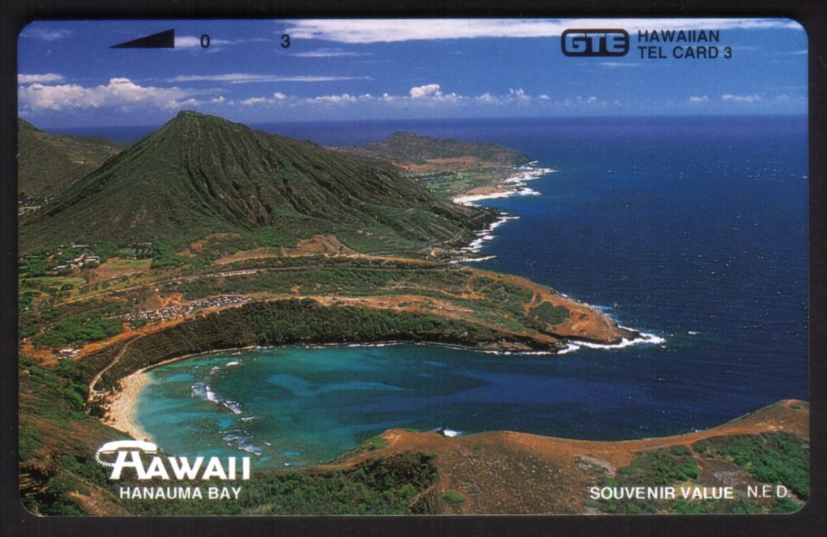 The card includes printed details in the top right corner: "GTE Hawaiian Tel Card 3" identifying it as a telephone card issued by GTE Hawaiian Telephone. The word "HAWAII" is prominently displayed in white text with "HANAUMA BAY" written beneath it at the bottom left corner. The lower right corner states "SOUVENIR VALUE N.E.D." The visual captures the natural beauty and iconic landscape of the Hanauma Bay nature preserve, a popular spot for snorkeling and sightseeing in Hawaii.