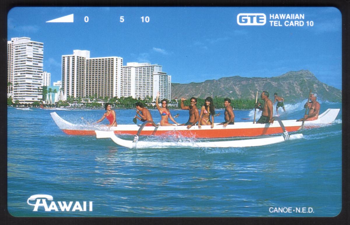Overall, the card combines elements of Hawaiian watersports, specifically canoeing, with recognizable Hawaiian landmarks, emphasizing leisure and travel themes connected to Hawaii’s coastal environment and culture.
