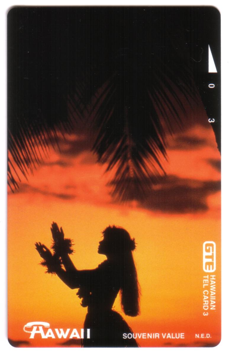 This GTE Hawaiian Telephone phone card is a scenic and cultural tribute to Hawaii, highlighting traditional hula dancing during a sunset. It is both a travel-themed collectible and a souvenir item that reflects Hawaiian heritage and natural beauty.