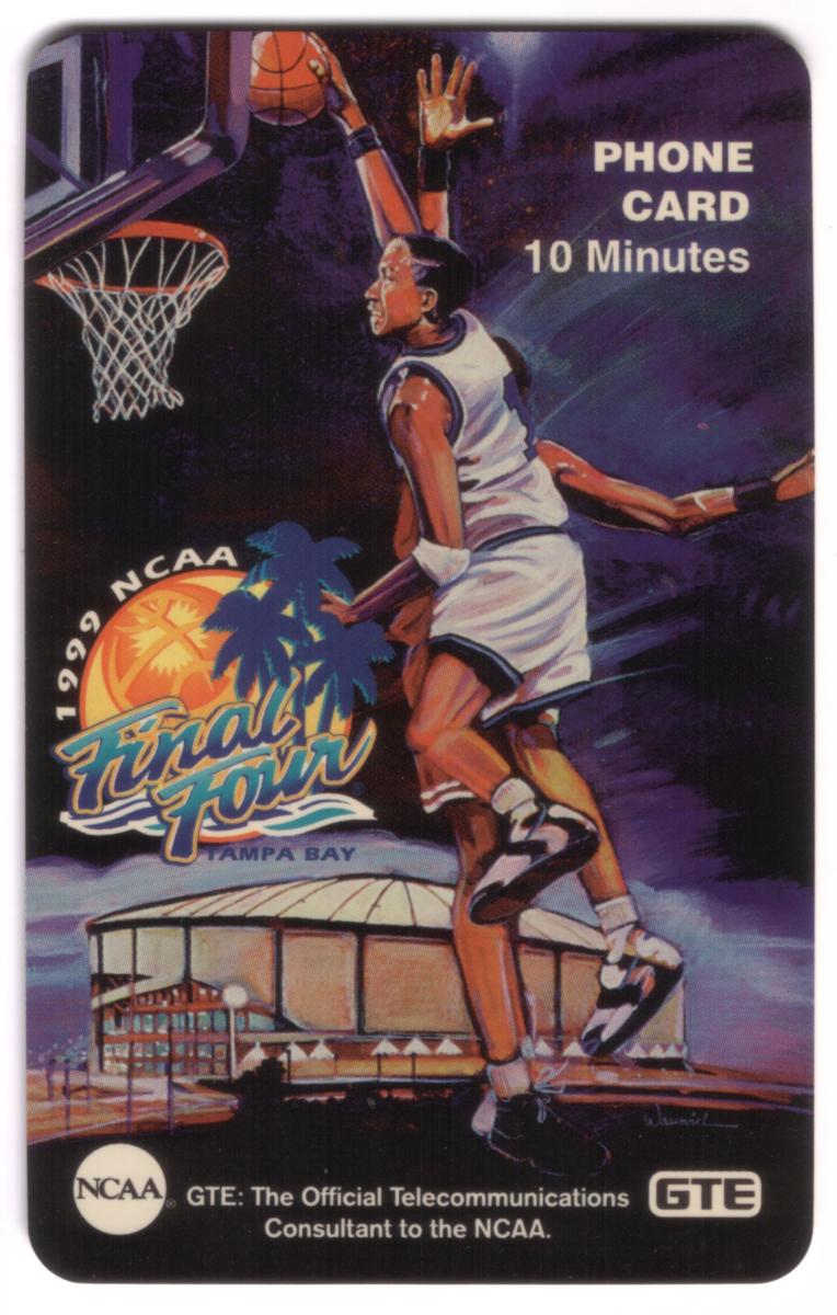 This collectible phone card features artwork related to the 1999 NCAA Final Four basketball event held in Tampa Bay, Florida. The main image on the card depicts a basketball player in mid-air, about to dunk the basketball into the hoop. The player wears a white basketball uniform with black trim and white basketball shoes. The background showcases a spotlight effect with shades of purple and blue, enhancing the dynamic action scene.