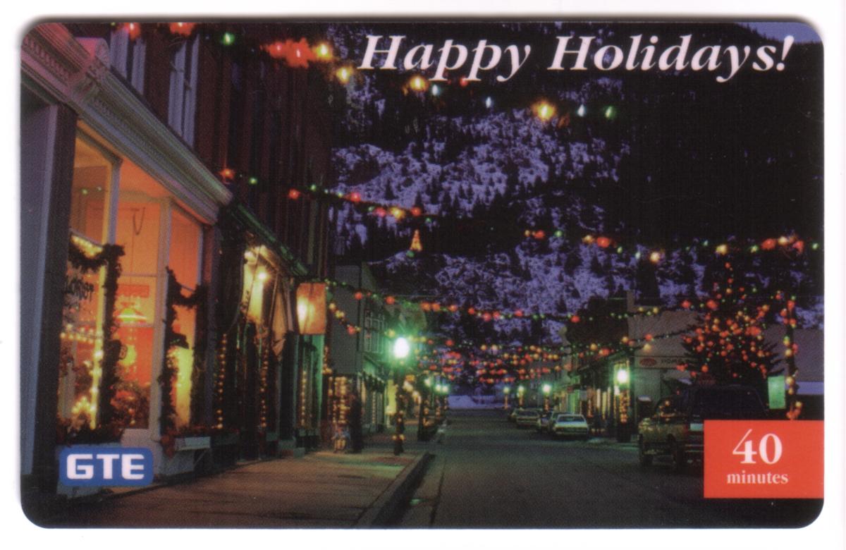 The card displays the greeting "Happy Holidays!" in white text positioned at the top right corner. The lower left corner shows the GTE Communications logo in blue and white, indicating the card’s telecommunications provider. In the lower right corner, a red box contains the white text "40 minutes," specifying the card’s usage time for phone services.