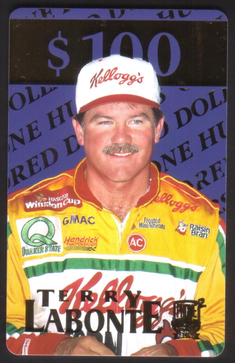 NASCAR driver Terry Labonte featured on a $100 phone card, showcasing his racing uniform, sponsor logos, and confident expression, ideal for collectors. |