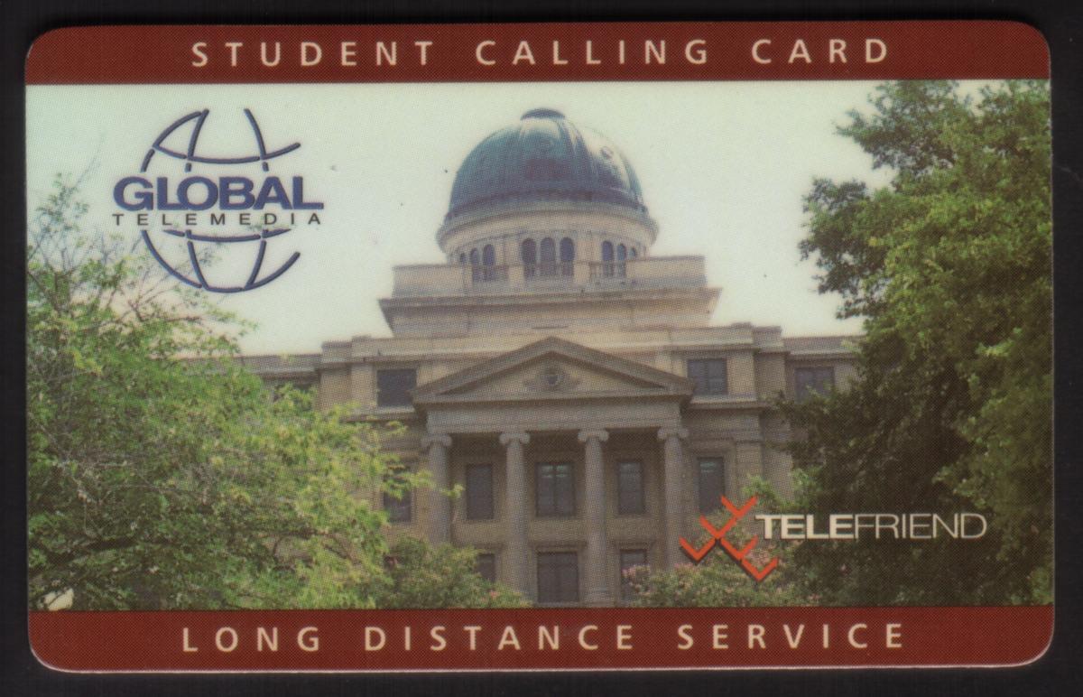This collectible Student Calling Card from Global Telemedia features a photographic image of a historic academic building with classical architecture. The building has tall columns supporting a pediment and is topped with a distinctive dome. The setting includes surrounding trees and clear skies, enhancing the stately atmosphere of the scene.