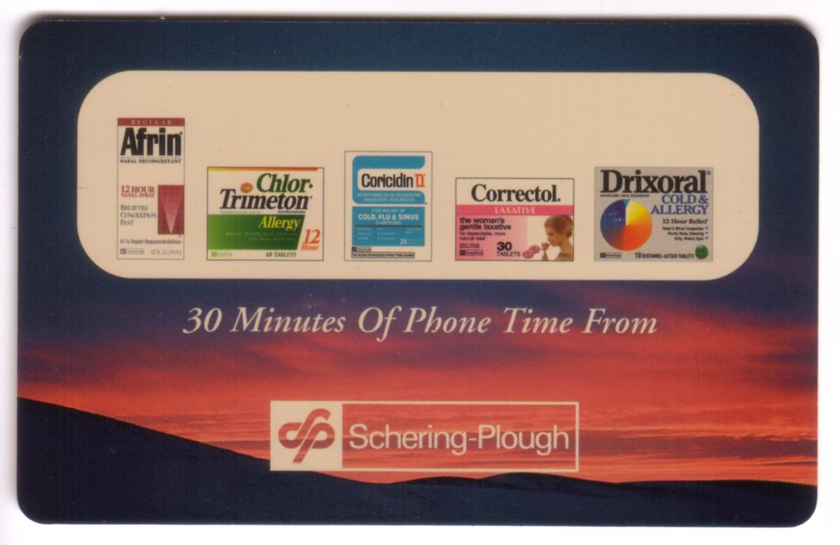 Pharmaceutical-themed prepaid phone card featuring Schering-Plough products like Afrin, Chlor-Trimeton, Coricidin, Correctol, and Drixoral with scenic sunset background. |