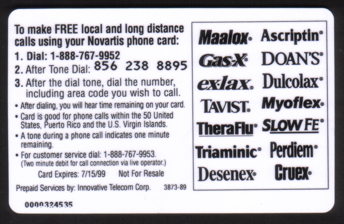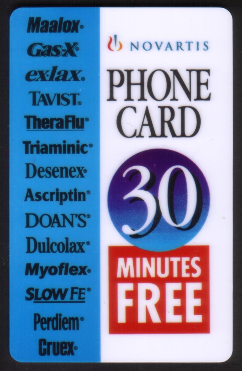 Novartis healthcare promotional phone card offering 30 free minutes, featuring product brands like Maalox, Gas-X, and Theraflu, from the 1980s-90s era. |