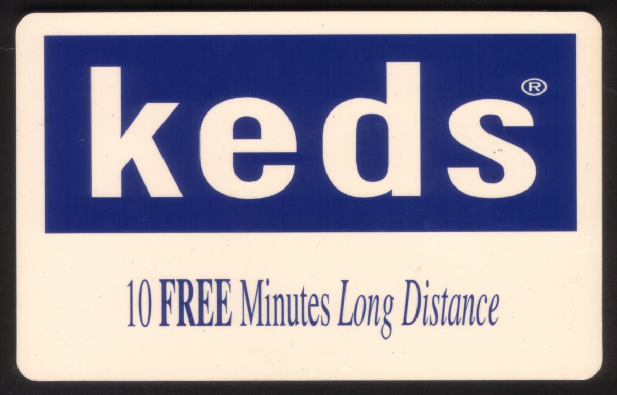The card promotes a 10-minute free long-distance calling offer linked to the Keds brand, known for footwear. The overall layout is minimalistic and functional, focusing on brand visibility and the promotional offer clearly without additional graphics or imagery.