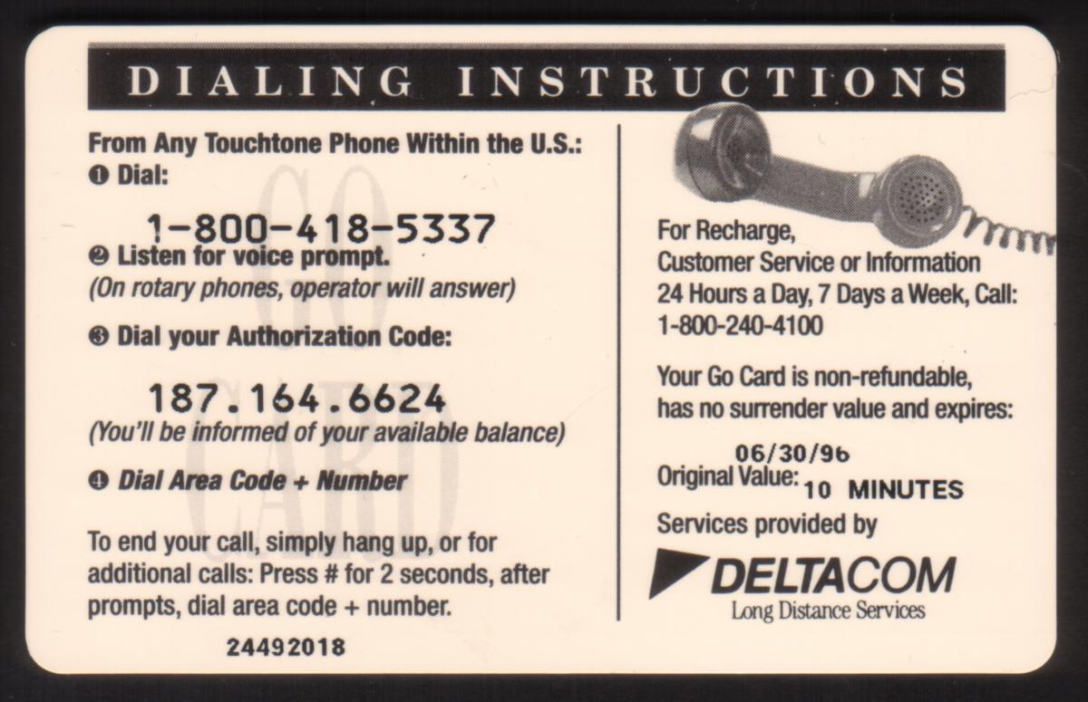 The card’s appearance and text align with its use as a prepaid phone card, intended for telecommunications purposes with an emphasis on free long-distance calling time. The issuing entity is DeltaCom, as indicated in the related keywords.