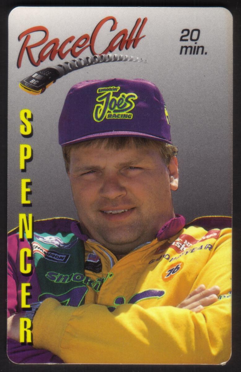 This phone card clearly celebrates Jimmy Spencer's association with "Smokin' Joe's Racing" and features automotive and NASCAR branding to emphasize its sports and auto racing theme.