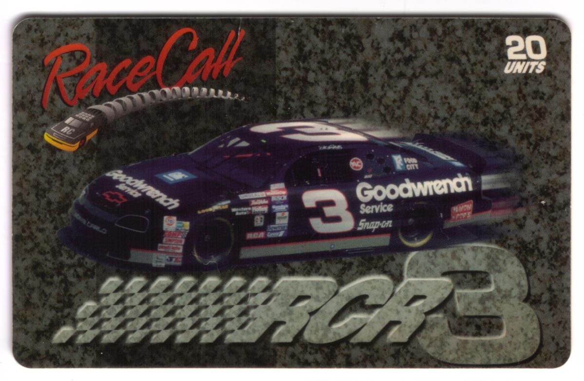 This card celebrates Dale Earnhardt’s No. 3 Winston Cup stock car, a legendary vehicle in NASCAR history. The combination of automotive branding, racing logos, and the racecall text indicates a theme focused on auto racing and NASCAR collectibles. The overall color scheme is mostly black and gray with contrasting text and logos emphasizing the car and team identity.