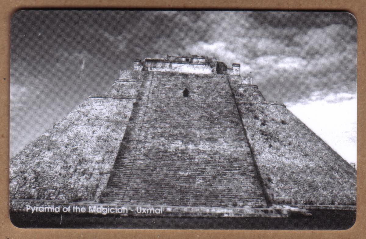 This collectible card features a detailed black-and-white photographic image of the Pyramid of the Magician, a Mesoamerican step pyramid located in Uxmal, Mexico. The pyramid stands prominently in the frame, showing its distinct steep stairway ascending the center of the structure. The texture and stone masonry of the pyramid are clearly visible, emphasizing the ancient architectural style of the Maya civilization.