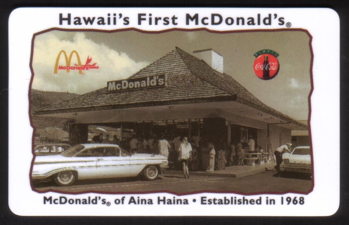 This collectible phone card features an image of Hawaii’s First McDonald’s restaurant, located at Aina Haina. The McDonald's establishment shown was founded in 1968. The picture on the card displays a vintage scene with classic cars parked outside the restaurant and several people gathered near the entrance, capturing a moment from the past.