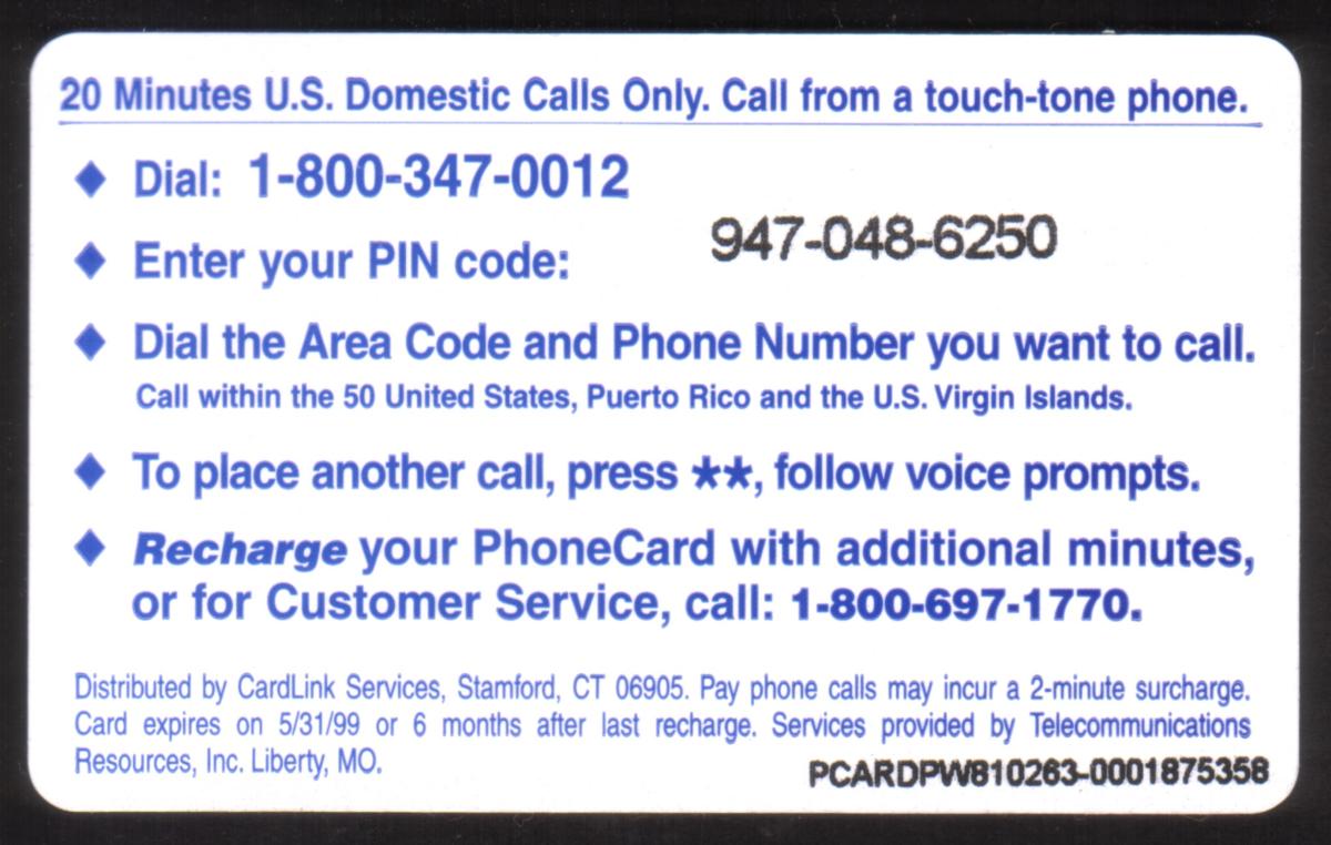 Since we have the world's largest inventory of USA phonecards for collectors, you will not necessarily receive the identical serial/batch/PIN number that we have scanned/pictured.