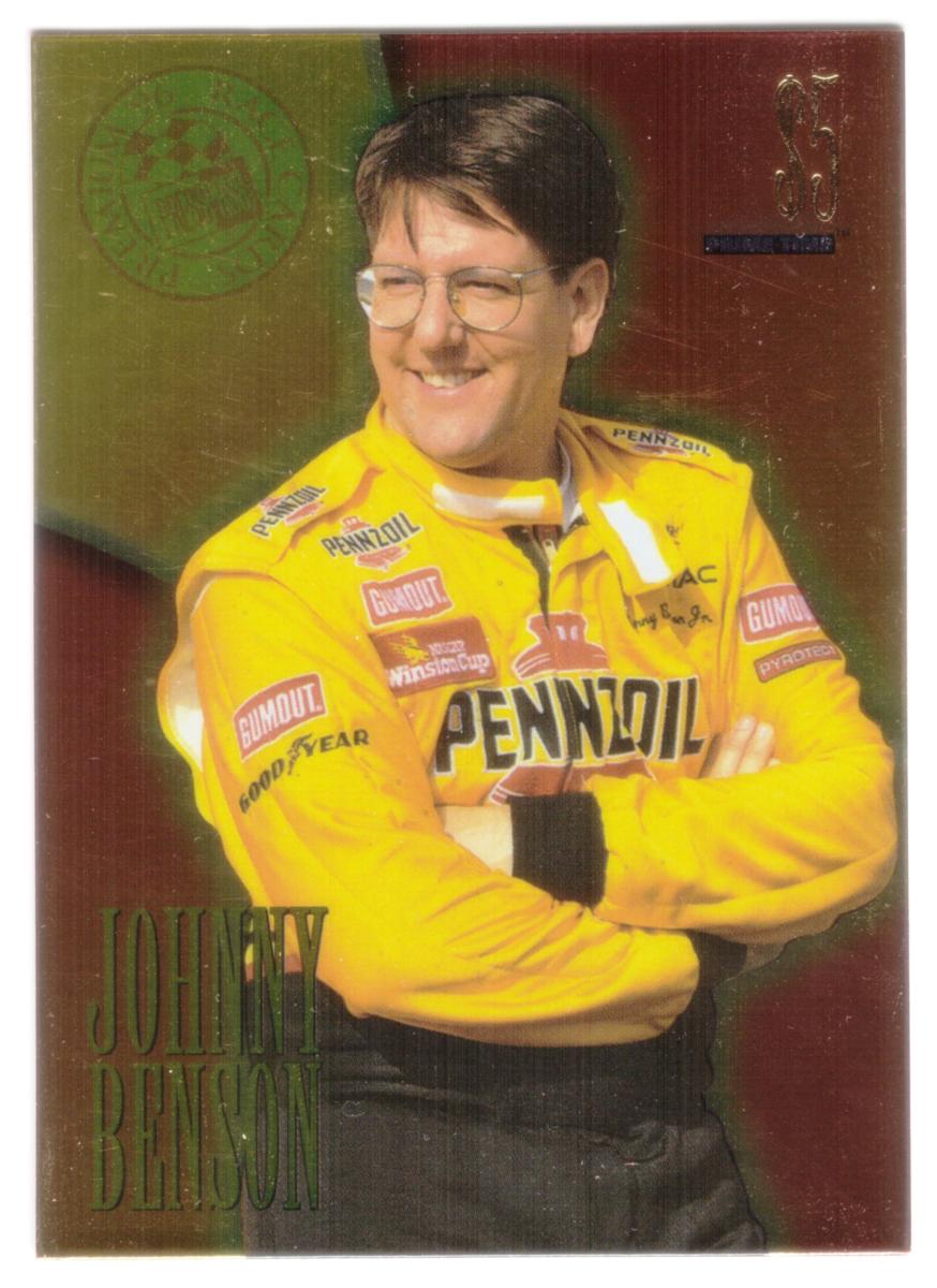 The card is associated with Pennzoil, a major sponsor, and highlights automotive racing themes with an emphasis on Johnny Benson’s racing career. The Ford Goodyear and Gumout logos reinforce the motorsport branding, aligning this card with collectible automotive racing memorabilia.