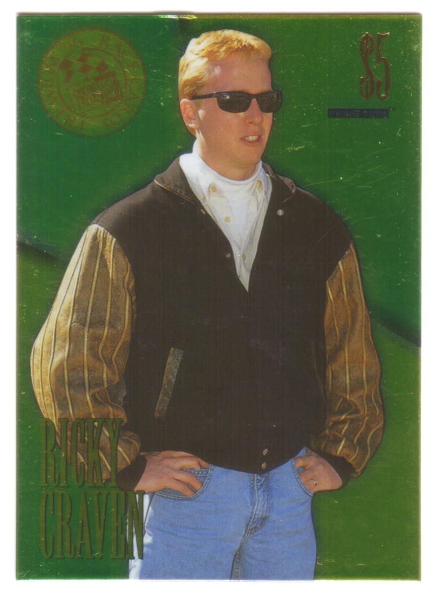 The card background is green with a gold circular emblem featuring a checkered racing flag design in the upper left corner. The denomination of the card is shown as "$5" in gold lettering near the upper right corner alongside the word "Prime Time." The bottom left corner displays Ricky Craven’s name in tall, bold green text.
