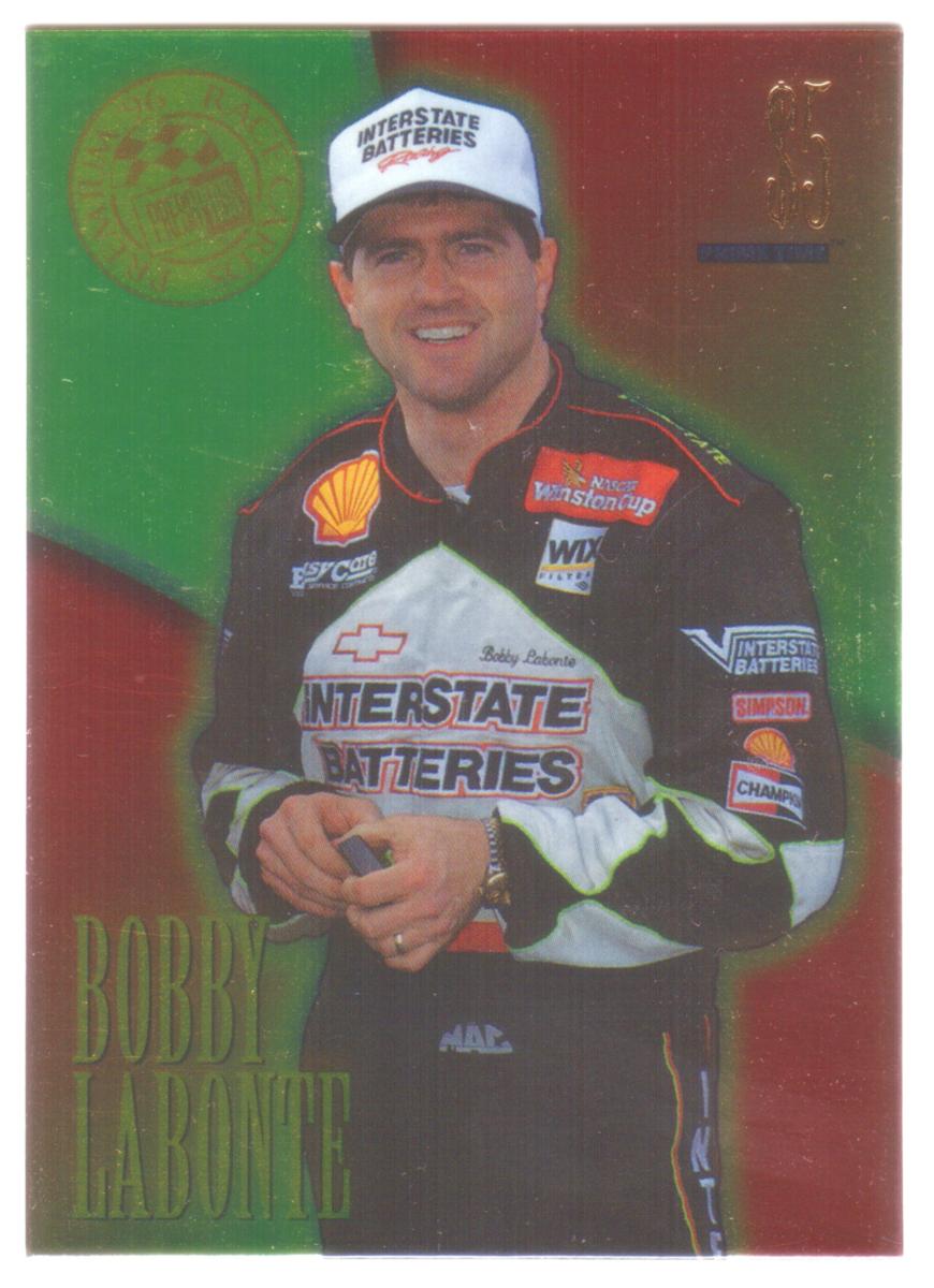 This card is part of the 1996 Press Pass Racing series, representing Bobby Labonte in his NASCAR career. The card is numbered 5 out of 9 in the series. It also includes logos referencing "Prime Time," "Interstate Batteries," and "Shell Oil," highlighting the notable sponsors associated with Bobby Labonte at the time. This collectible merges the themes of motorsports and premium auto racing memorabilia.