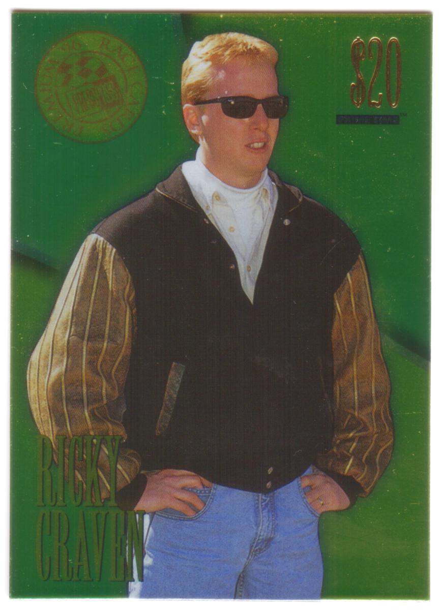 In the upper right corner of the card, the value "$20" is prominently displayed in gold lettering. The name "RICKY CRAVEN" appears in vertical green stylized text along the lower left side of the card. A faint circular emblem with racing themes is embossed in the top left corner of the card.