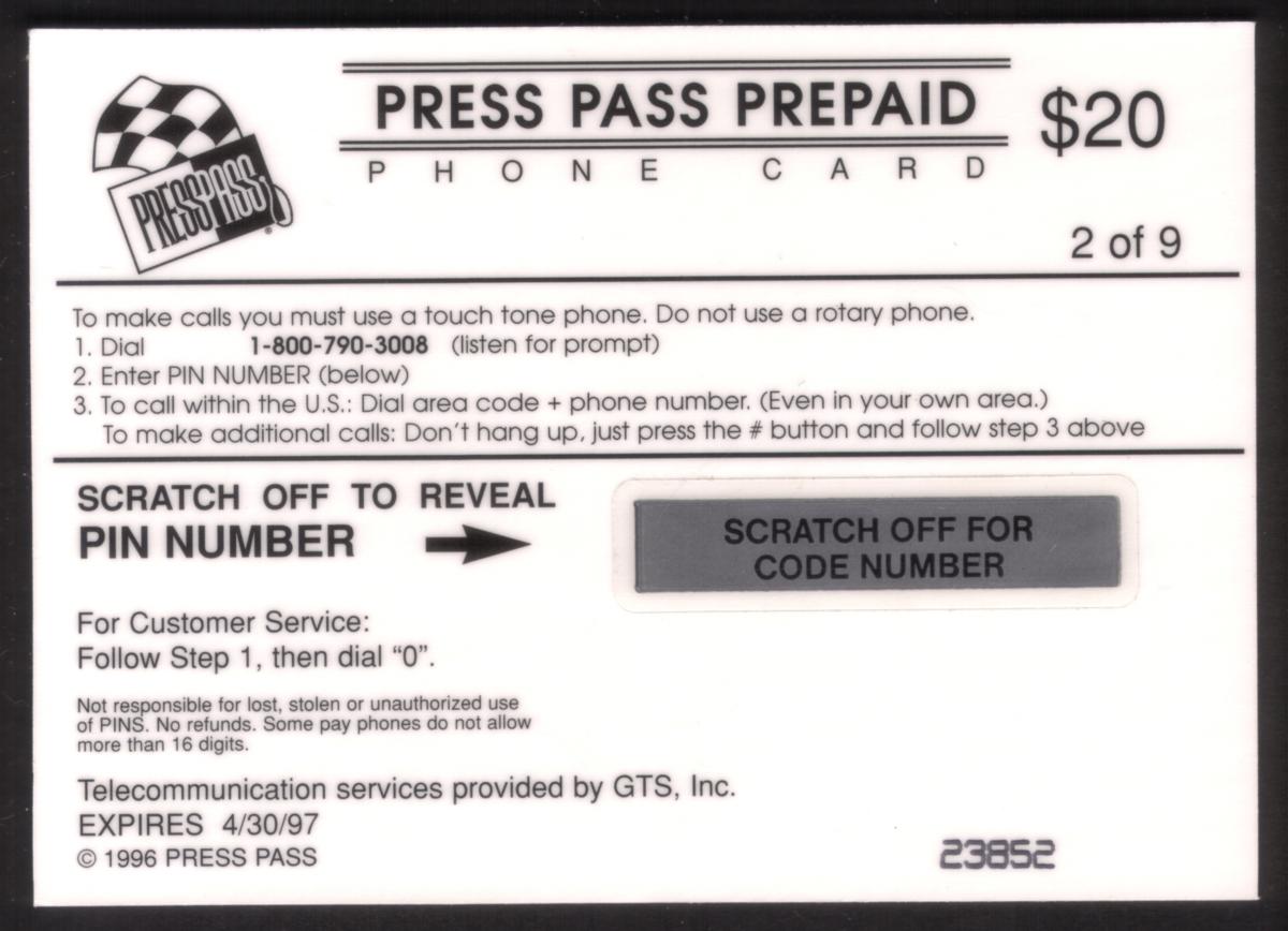 This card is part of the 1996 Press Pass Racing series focused on NASCAR auto racing. The card is numbered 2 of 9 in the set and issued by Global Tel. Solutions under the "premium race cards" line, highlighting its collectible status within automotive and NASCAR memorabilia.
