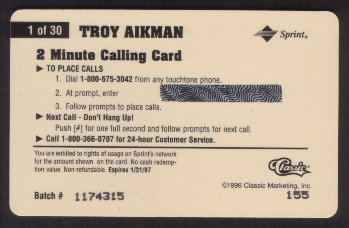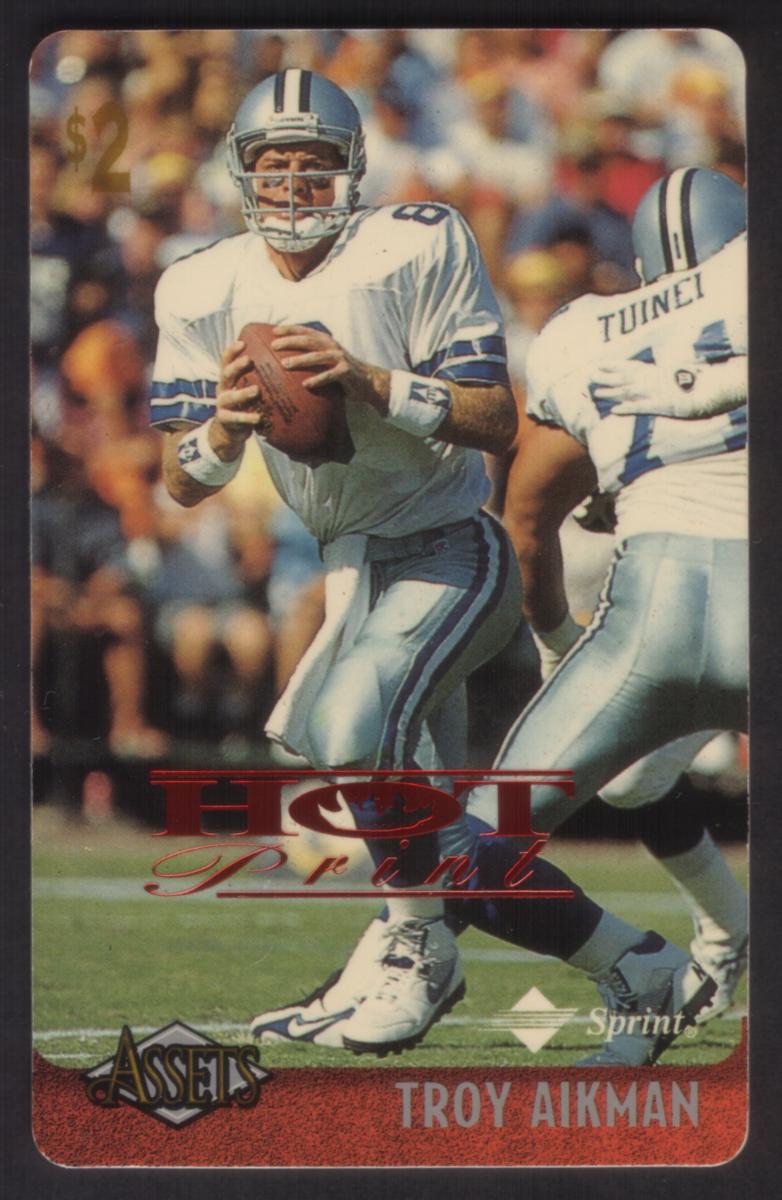 The card is themed "HOT PRINT" with this text prominently displayed in red across the middle. The lower portion of the card includes the "Assets '96" logo on the left side and the "Sprint" logo on the right side in white. Troy Aikman’s name is printed in capital letters at the bottom right corner on a brick-red background. The overall design emphasizes the sport of American football and Major League Football (NFL), focusing on a well-known athlete.