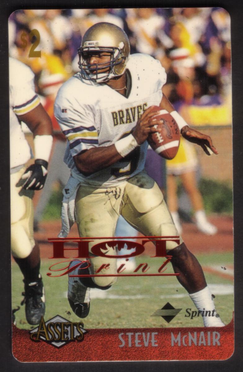 This collectible phone card features an image of Steve McNair in action, wearing a white football uniform with "BRAVES" written across the chest, gold pants, and a gold helmet without a visible number. McNair is captured holding a football, looking to his right as if preparing to pass or run. The background shows blurred figures and the green field of a football stadium.