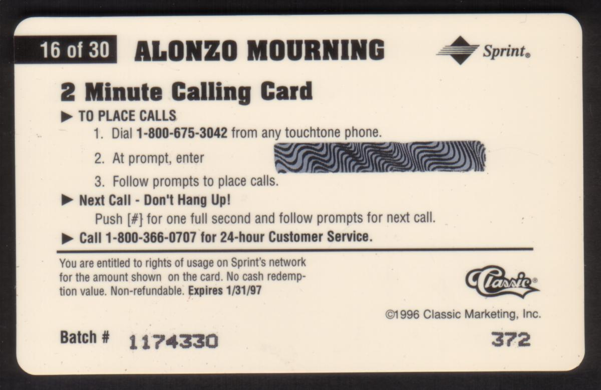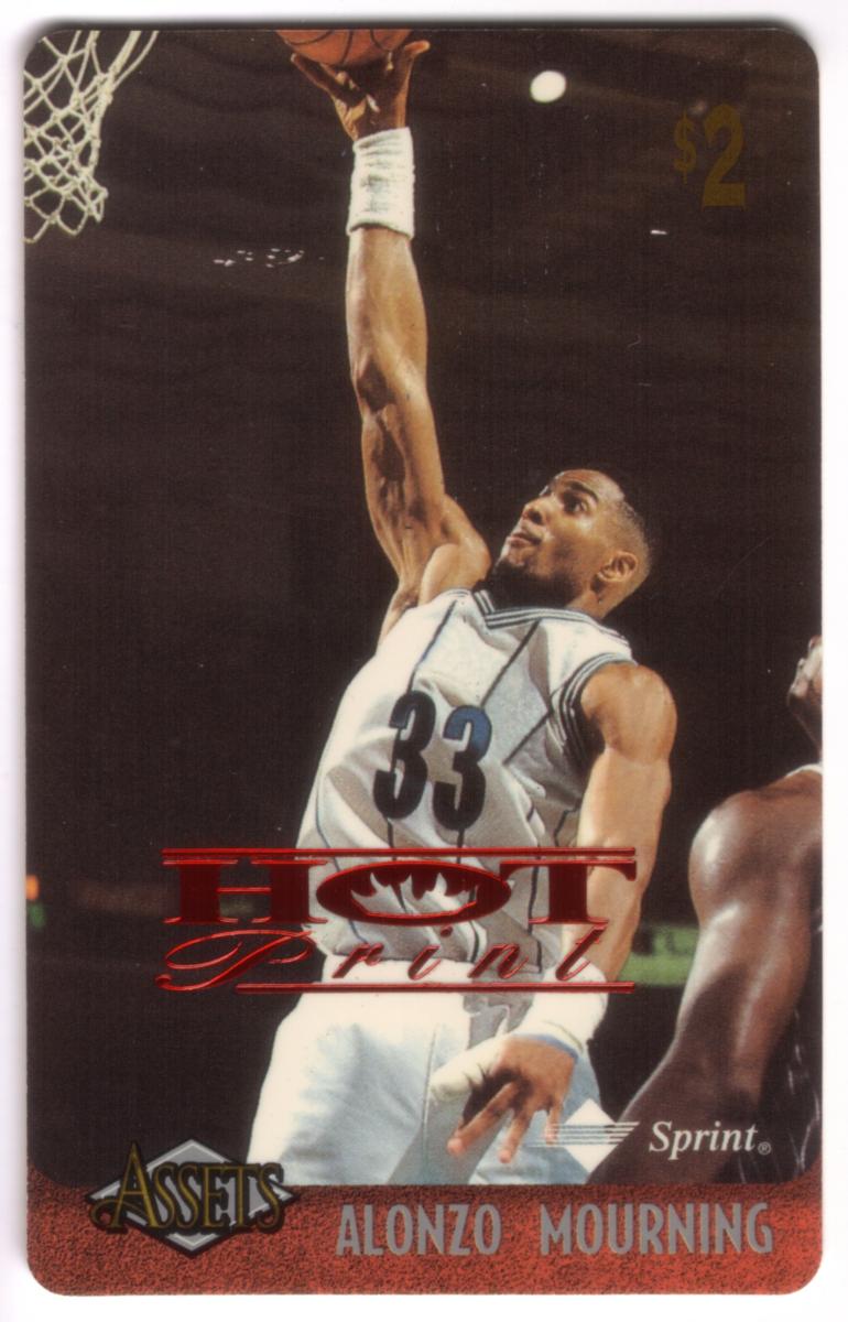 The card has a $2 value printed in gold in the top right corner. The lower portion of the card shows the "ASSETS" logo on the left and Alonzo Mourning’s name in capital letters across the bottom in blue and red. The "Sprint" logo is positioned to the right, signifying a sponsorship or branding relationship.