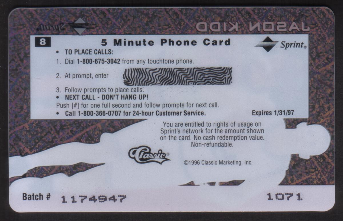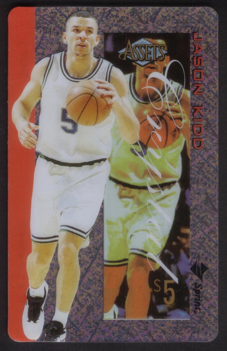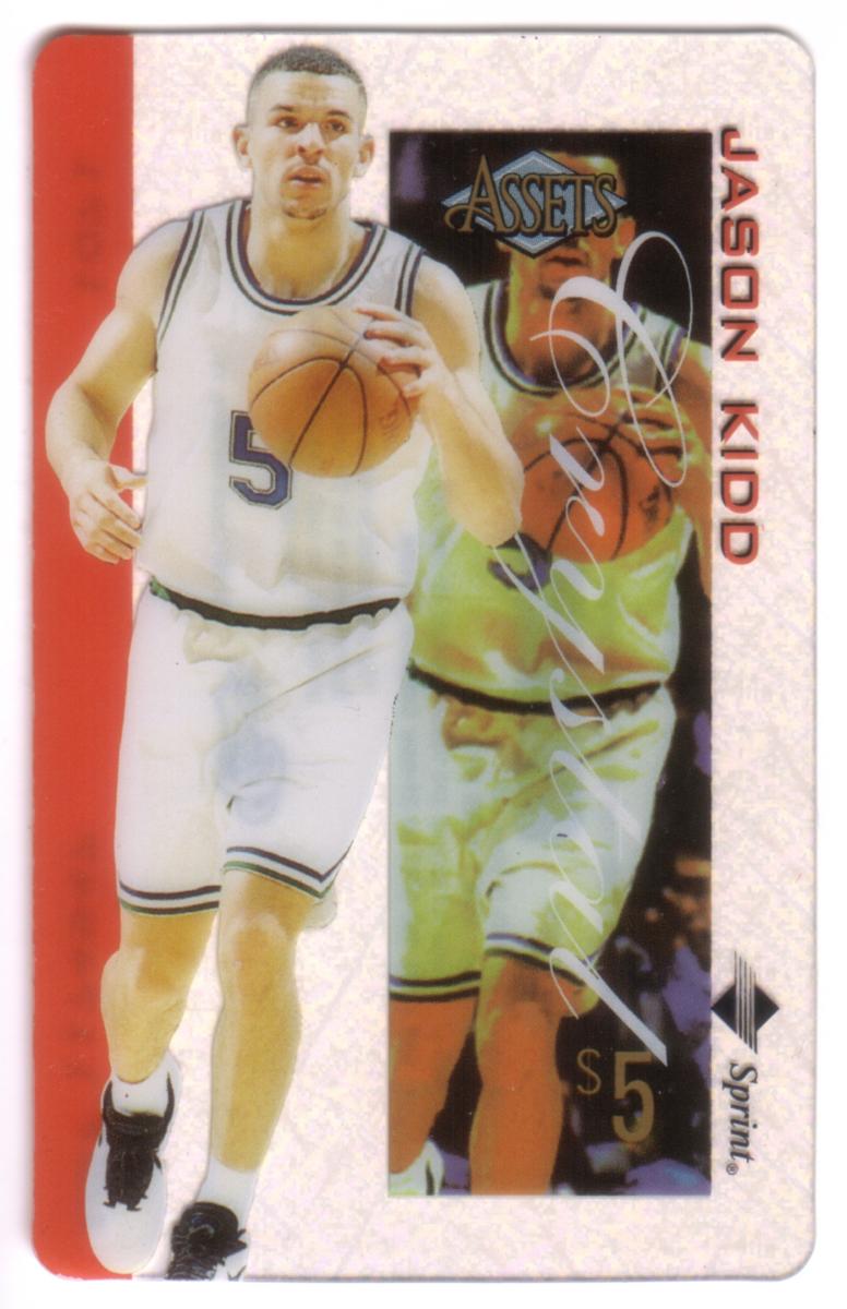 The card belongs to the Assets '96 series and is numbered 8 of 10. A large, stylized signature of Jason Kidd appears vertically across the middle-right side of the card in silver or white script. The name "JASON KIDD" is printed vertically in red letters along the right edge of the card. The official NBA logo and the Sprint branding logo appear near the bottom right corner, with a small gold "$5" symbol included within the design. The background features a patterned gradient with a secondary image of Jason Kidd in action, slightly offset behind the primary figure.