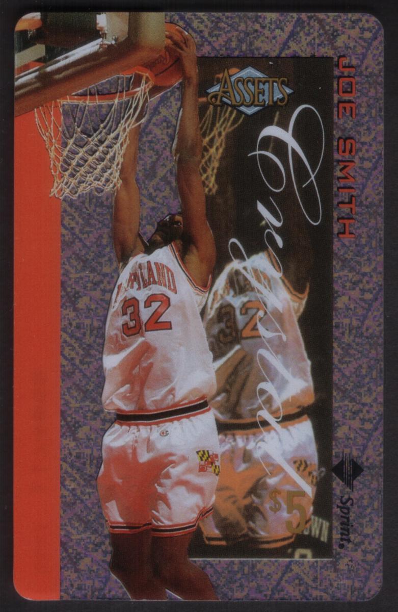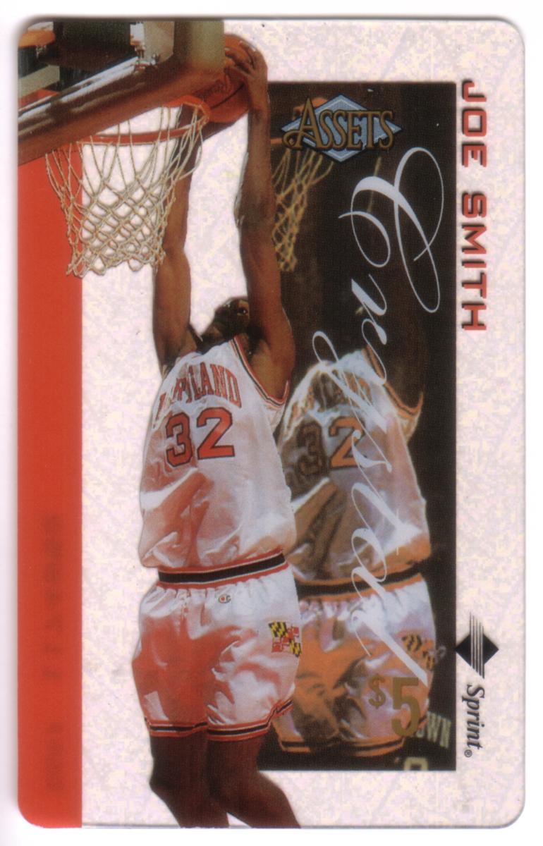 This collectible card features NBA player Joe Smith wearing a white basketball uniform with the number 32. The uniform indicates he is playing for the Maryland Terrapins, as noted by the "MARYLAND" text on the front of his jersey and the terrapin logo on his shorts. Joe Smith is pictured in an athletic pose, jumping towards the basketball hoop to make a dunk or shot.