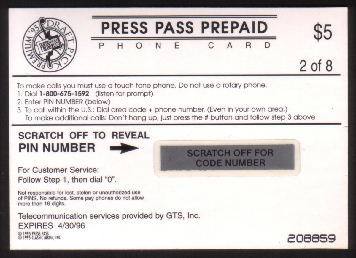 This phone card is from the Press Pass Basketball 1995 Draft Pick series and highlights Jason Kidd as a premium draft pick. It is issued by Global Tel. Solutions. The card is highly collectible for basketball fans and memorabilia collectors, especially those interested in 1990s sports collectibles and basketball history related to the California Golden Bears and the NBA draft.