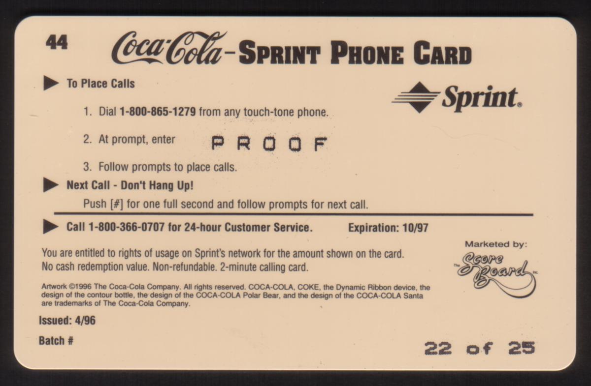 This phone card is numbered 44 of 48 from The Score Board Inc. series and is associated with the keywords: Coca-Cola logos, Coca Cola logos, Coke logos, prenez un coke PROOF Coca-Cola '96 $2. Hands With Bottles (1953) Coke Card #44 of 48.