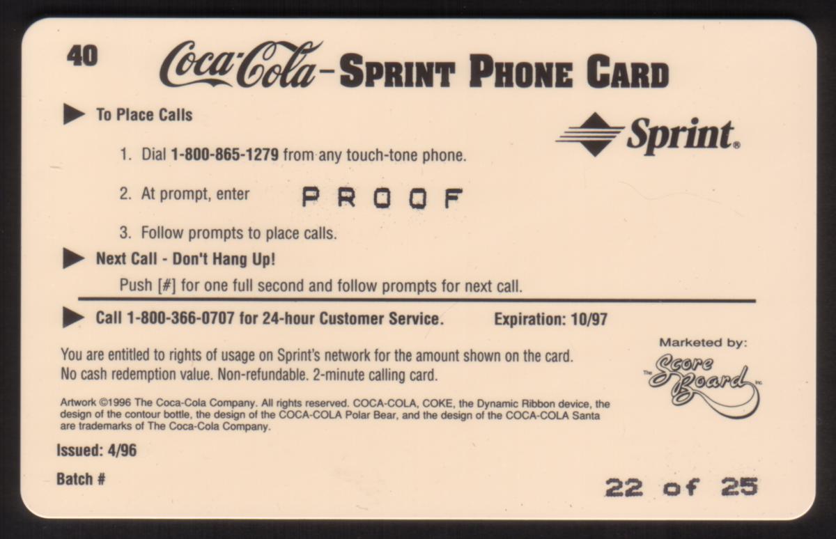 This phone card is numbered #40 of 48 and is produced by The Score Board Inc. It includes multiple Coca-Cola logos and Coke logos, emphasizing its official collectible status. The design highlights the classic Americana feel of Coca-Cola memorabilia.