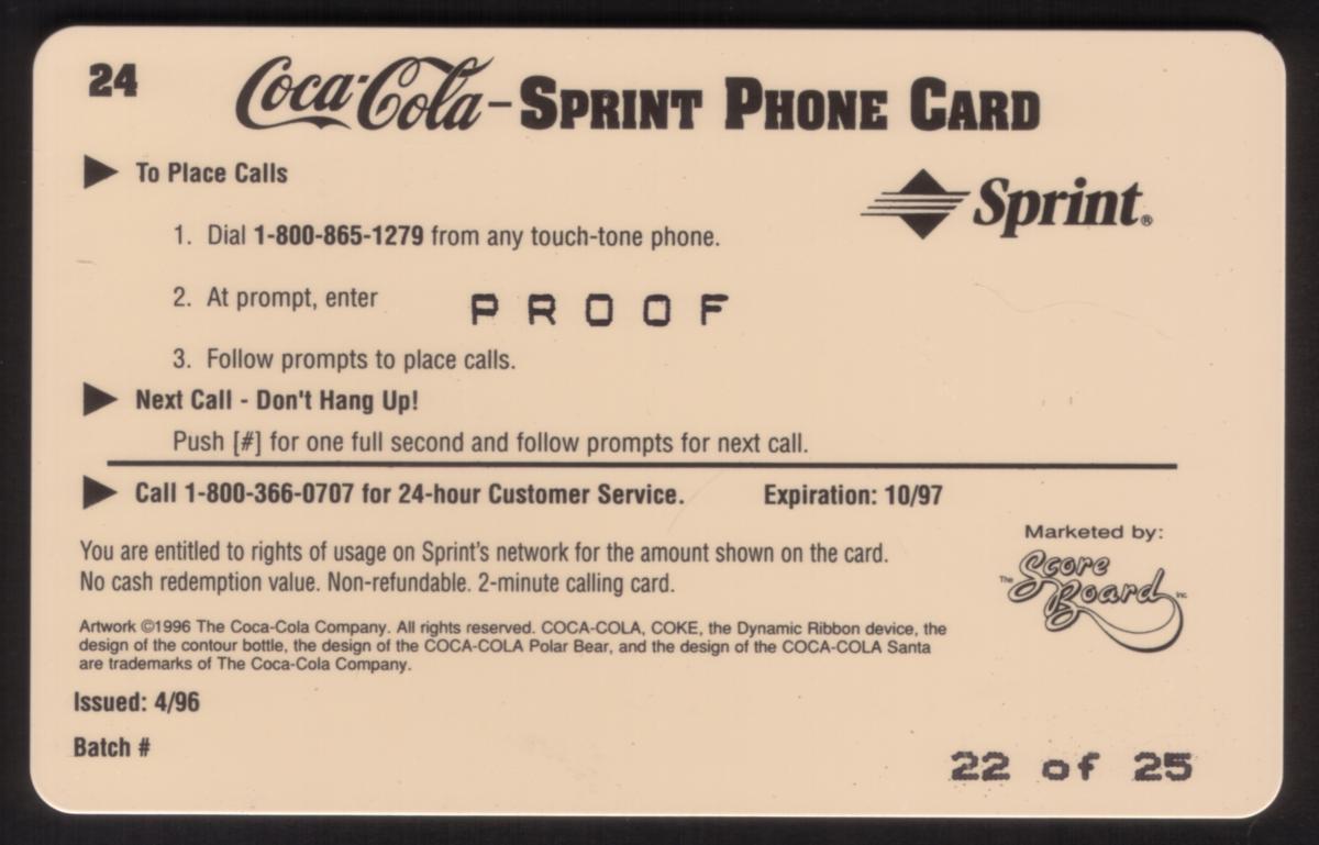 The card includes multiple Coca-Cola logos, including the recognizable red script on the bottle and the lollipop, as well as additional Coke branding elements that emphasize its authenticity and connection to the Coca-Cola brand heritage. This phone card is part of a collectible series by The Score Board Inc. and carries the PROOF Coca-Cola '96 branding.