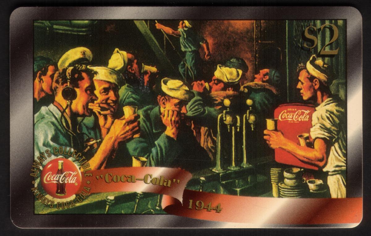 Prominently displayed in the image are Coca-Cola logos, including one on a soda dispenser and another on a sign behind the soda taps. The card includes a gold emblem with the Coca-Cola logo and text around it reading “Coca-Cola” and the year "1944," highlighting the historical connection. The text "S2" is visible in the upper right corner, identifying the card's series.