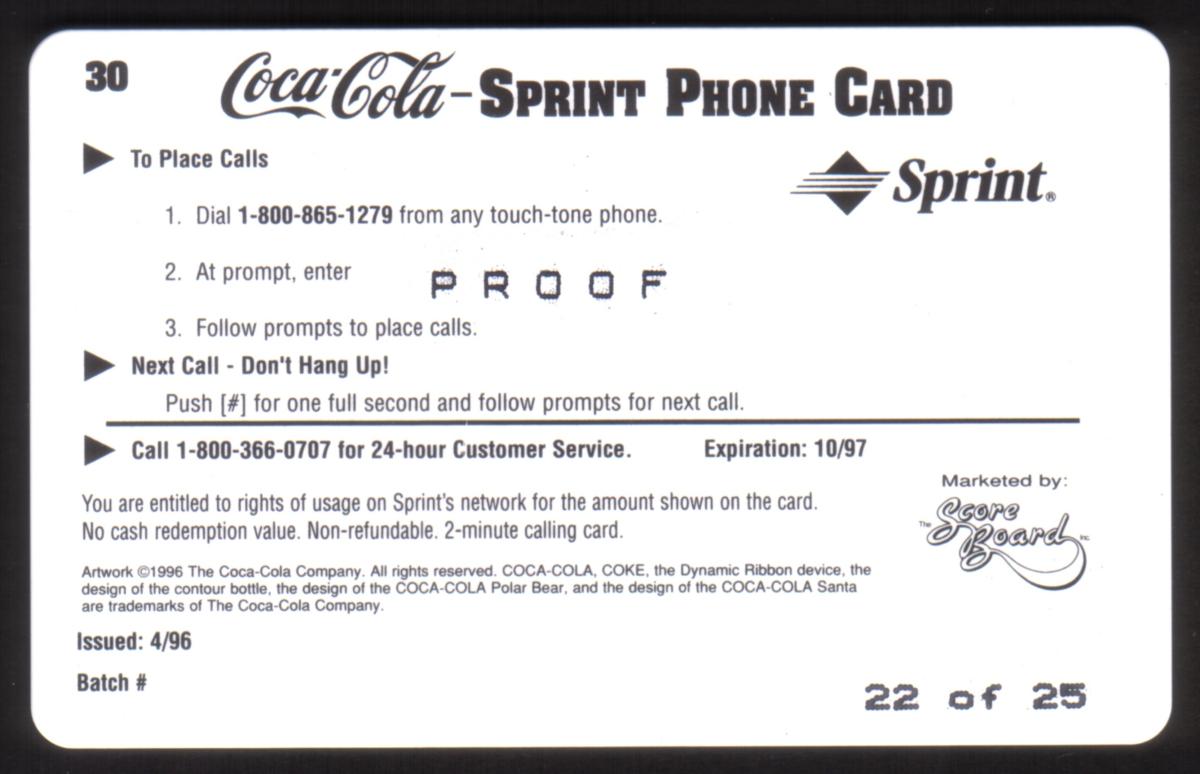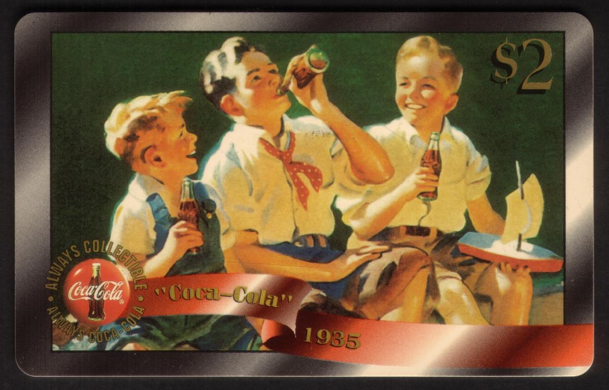 This phone card is part of The Score Board Inc. PROOF Coca-Cola ’96 collection, featuring vintage Coca-Cola imagery and logos alongside motifs such as coca-cola bottles, sailboats, and children’s toys. The artwork captures a timeless moment of refreshment and childhood joy linked to the Coca-Cola brand.