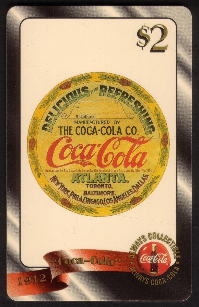 Below the Coca-Cola logo, multiple cities are listed in capital letters: Atlanta, Toronto, Baltimore, New York, Philadelphia, Chicago, Los Angeles, and Dallas. The label also notes a quantity of "5 Gallons," indicating the volume of syrup. The card has a face value of $2 printed in the upper right corner.