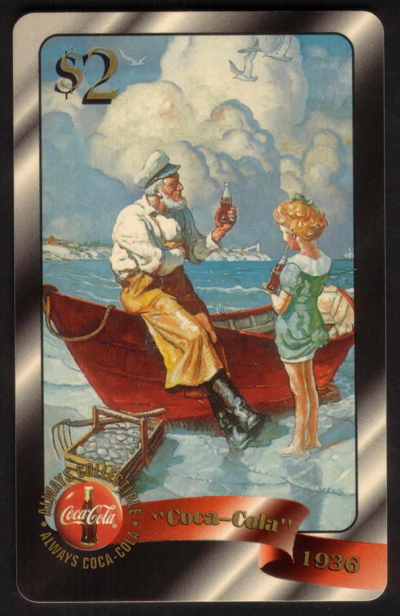 The card includes several Coca-Cola logos, one circular red logo on the lower left corner with the text "Always Coca-Cola" surrounding it. Below the logo, a red ribbon banner displays the text '"Coca-Cola" 1936'. The value "$2" is printed in the top left corner in gold. The overall design captures a nostalgic maritime theme combined with classic Coca-Cola branding, emphasizing a timeless connection between the beverage and coastal life.