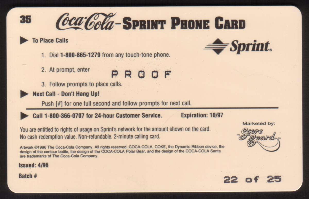 This card is numbered 35 of 48 in the series and is a PROOF edition from 1996. It is issued by The Score Board Inc., tying together vintage artwork with collectible Coca-Cola imagery featuring boats, water, birds, and the iconic bottle.