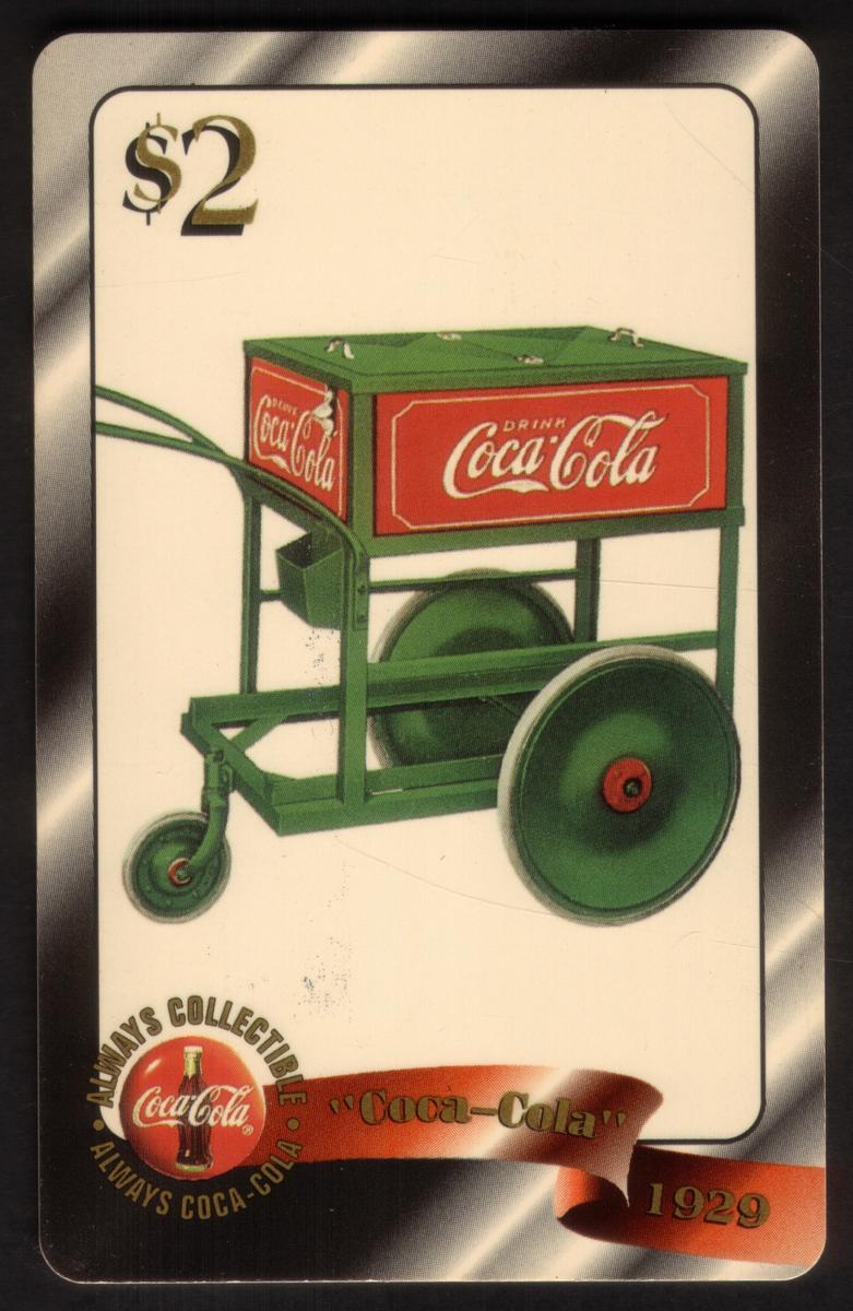 The card displays the denomination "$2" in gold lettering in the upper left corner. Along the bottom left edge, there is a round Coca-Cola logo with the text "Always Collectible Always Coca-Cola." Next to the logo is a gold ribbon banner that reads “Coca-Cola” and “1929,” denoting the year of the cooler’s design.
