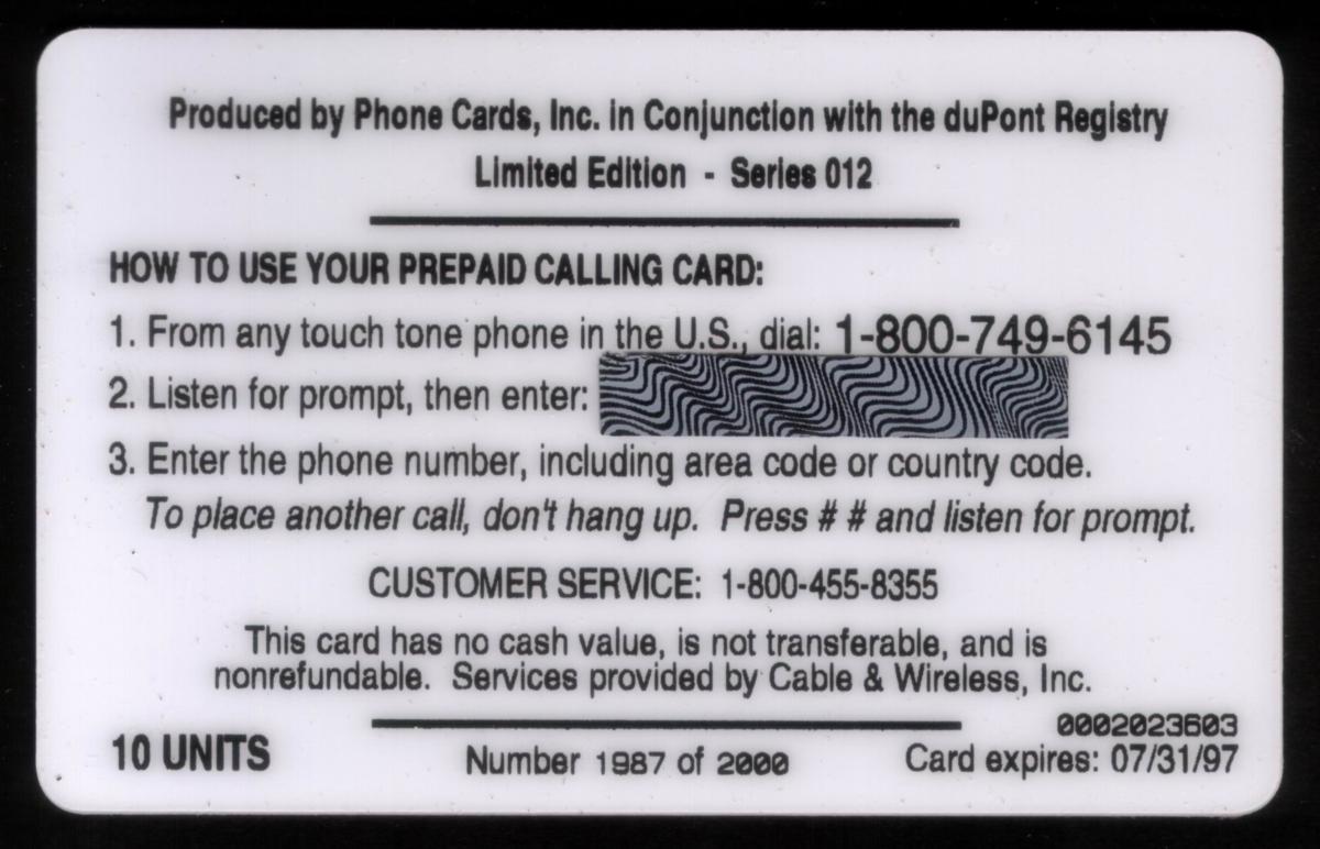 Since we have the world's largest inventory of USA phonecards for collectors, you will not necessarily receive the identical serial/batch/PIN number that we have scanned/pictured.