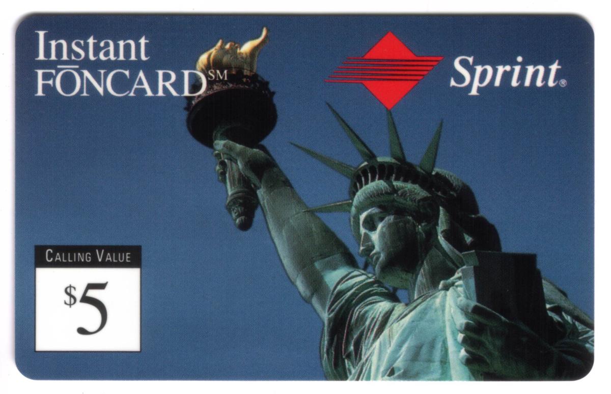 Patriotic Statue of Liberty design on a Sprint prepaid calling card with $5 value, featuring brand logo, usage info, and a magnetic stripe for calling convenience. |