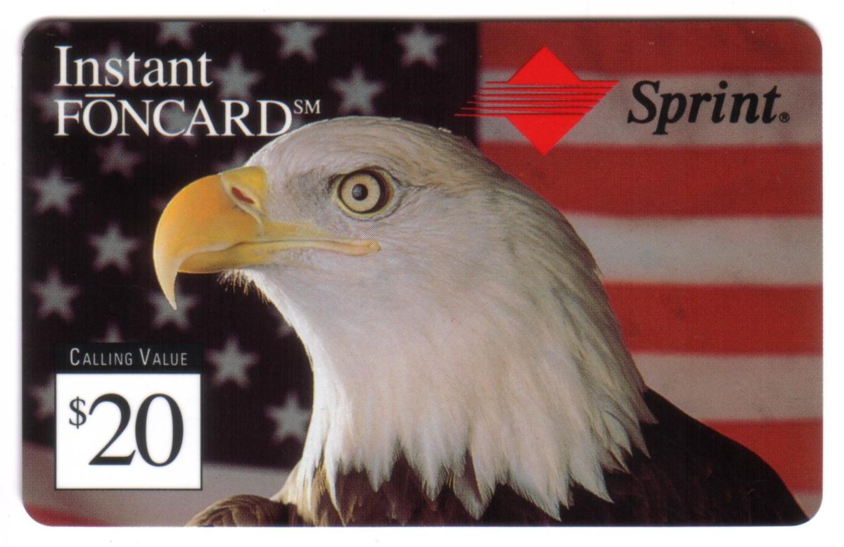 The card has a printed calling value of $20 in the lower left corner. The upper left corner includes the text "Instant FONCARD SM" in white text, and the upper right corner displays a red diamond-shaped logo followed by the word "Sprint" in black font. The design and imagery highlight the importance of the American Bald Eagle as an endangered species and an iconic representation of national pride and wildlife conservation.