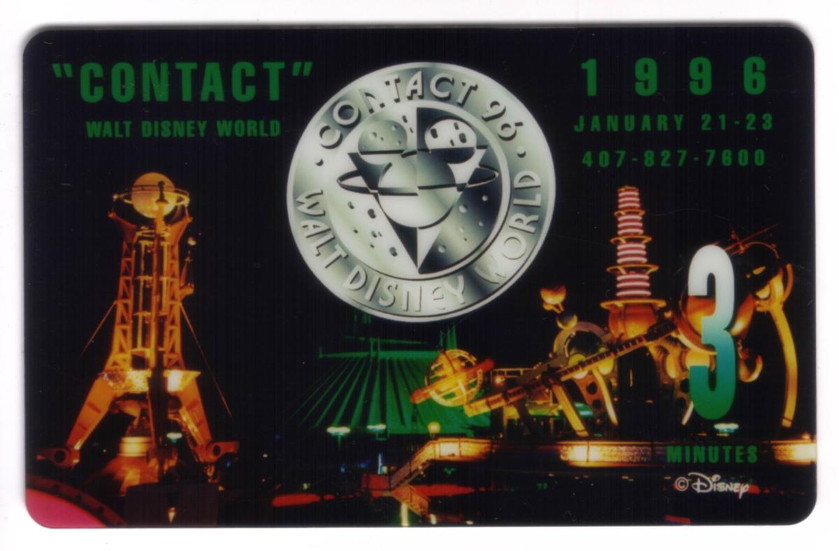 At the top left, the card includes the text '"CONTACT"' and "WALT DISNEY WORLD" in green uppercase letters. The Disney copyright symbol appears in the lower right corner, confirming its official licensing. This phone card commemorates the 1996 Walt Disney World "Contact 96" convention and highlights notable features and imagery associated with the theme park.