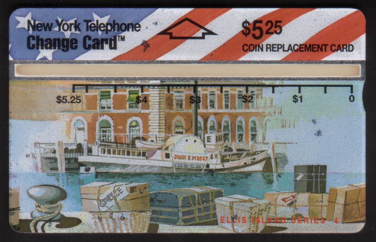 The card is a New York Telephone Change Card marked with a value of $5.25. A stamped scale runs along the top, indicating coin replacement amounts ranging from $0 to $5.25. The card also includes the text "ELLIS ISLAND SERIES 4" in red near the lower right corner, indicating it is part of a series focused on Ellis Island, a significant American historical landmark. The waterfront setting, the boat, and the dock all connect to New York City’s immigrant and maritime history.