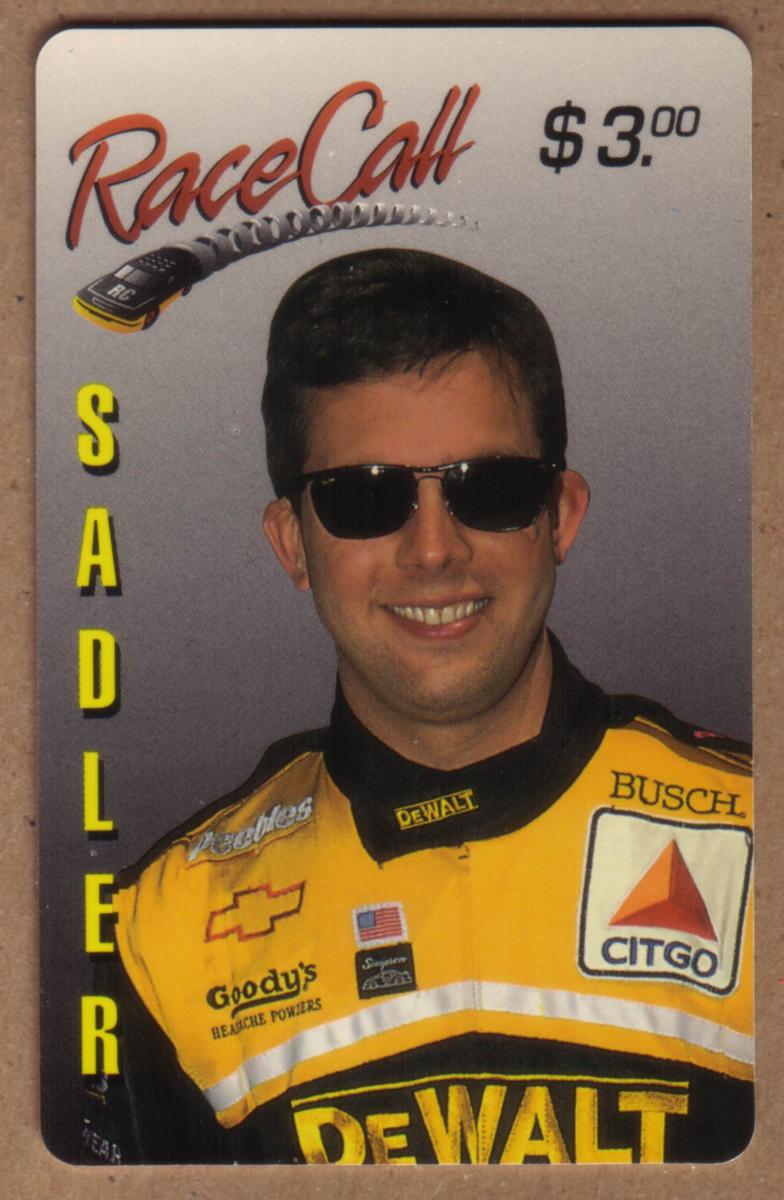 The card design includes the word "RaceCall" in an italic script font with a checkered flag element above Sadler’s head on the left side. The text "$3.00" appears on the top right corner. The name "SADLER" is written vertically in yellow capital letters along the left side of the card.
