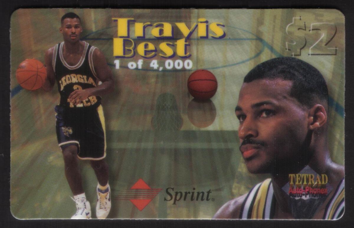 Overall, this phone card combines sports memorabilia with prepaid calling card functionality, showcasing a basketball player with clear branding elements related to basketball and telecommunications. The card’s layout and color scheme are visually balanced to spotlight Travis Best and the sport within the context of a collectible phone card.