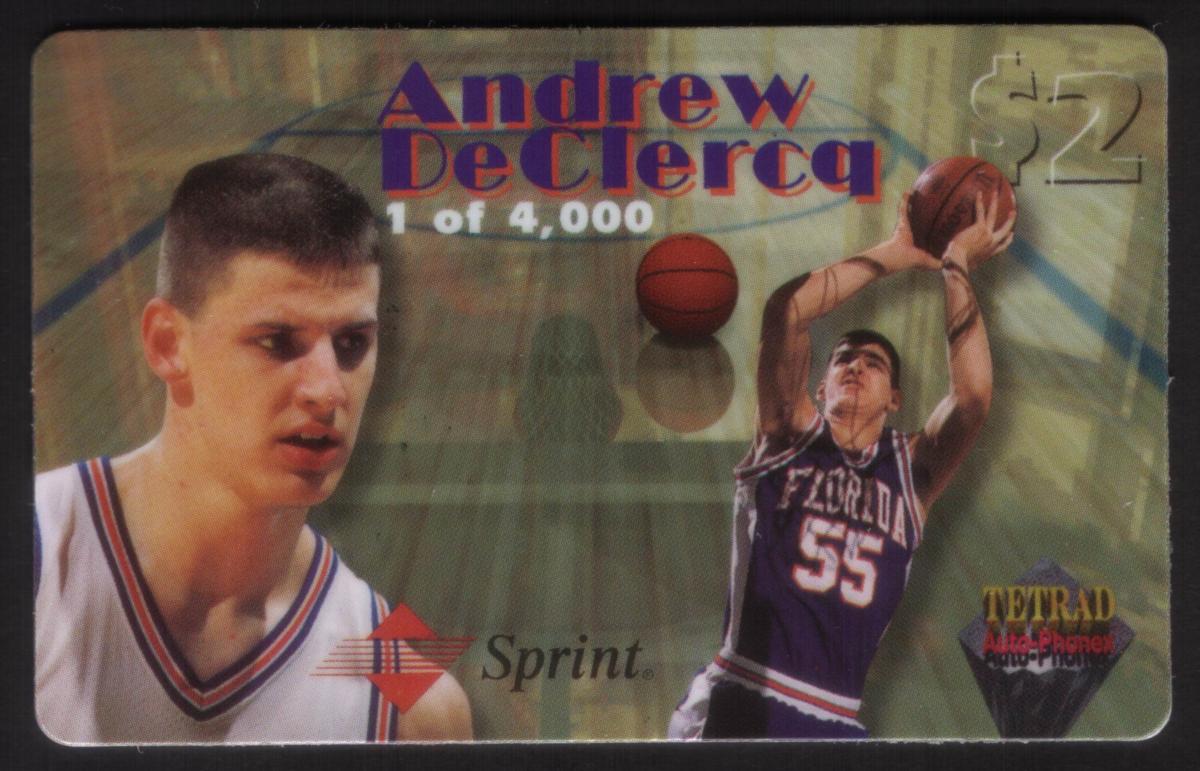 This card is a collectible related to basketball sports memorabilia, featuring Andrew DeClercq as the central sports figure. It is part of a series or set highlighting basketball players through branded collectible cards, with Sprint and WorldCom as sponsors or endorsing entities.