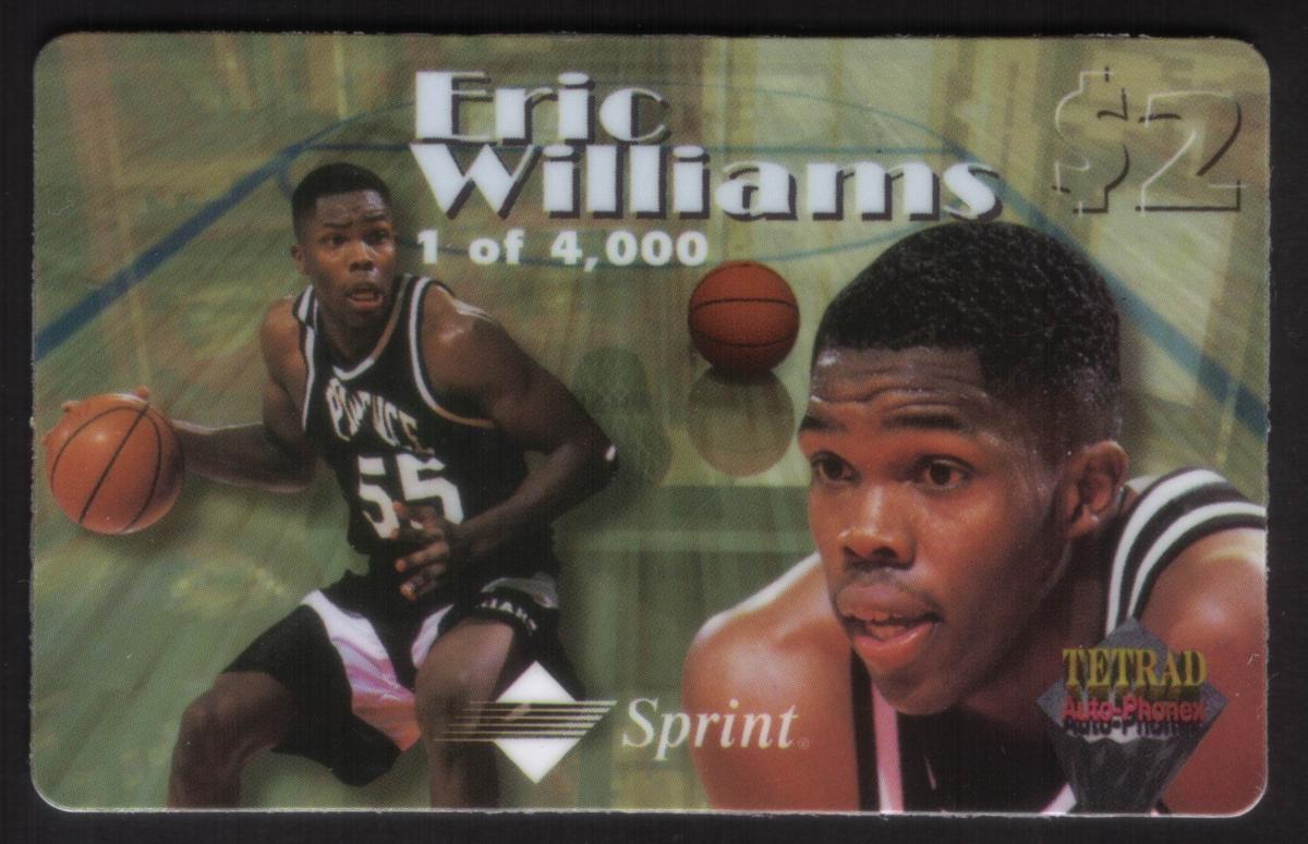 This card is a collectible phone card designed for basketball enthusiasts and fans of Eric Williams. It highlights important player information and integrates corporate branding linked to Sprint, making it an attractive piece for collectors interested in sports-themed phone cards.