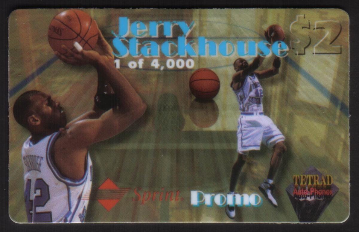 Overall, the card visually merges basketball imagery with branding elements, highlighting Jerry Stackhouse’s presence in the sport and its association with Sprint’s promotional efforts. The card’s design uses bold colors and purposeful text to emphasize both the player and the promotional nature of the item.